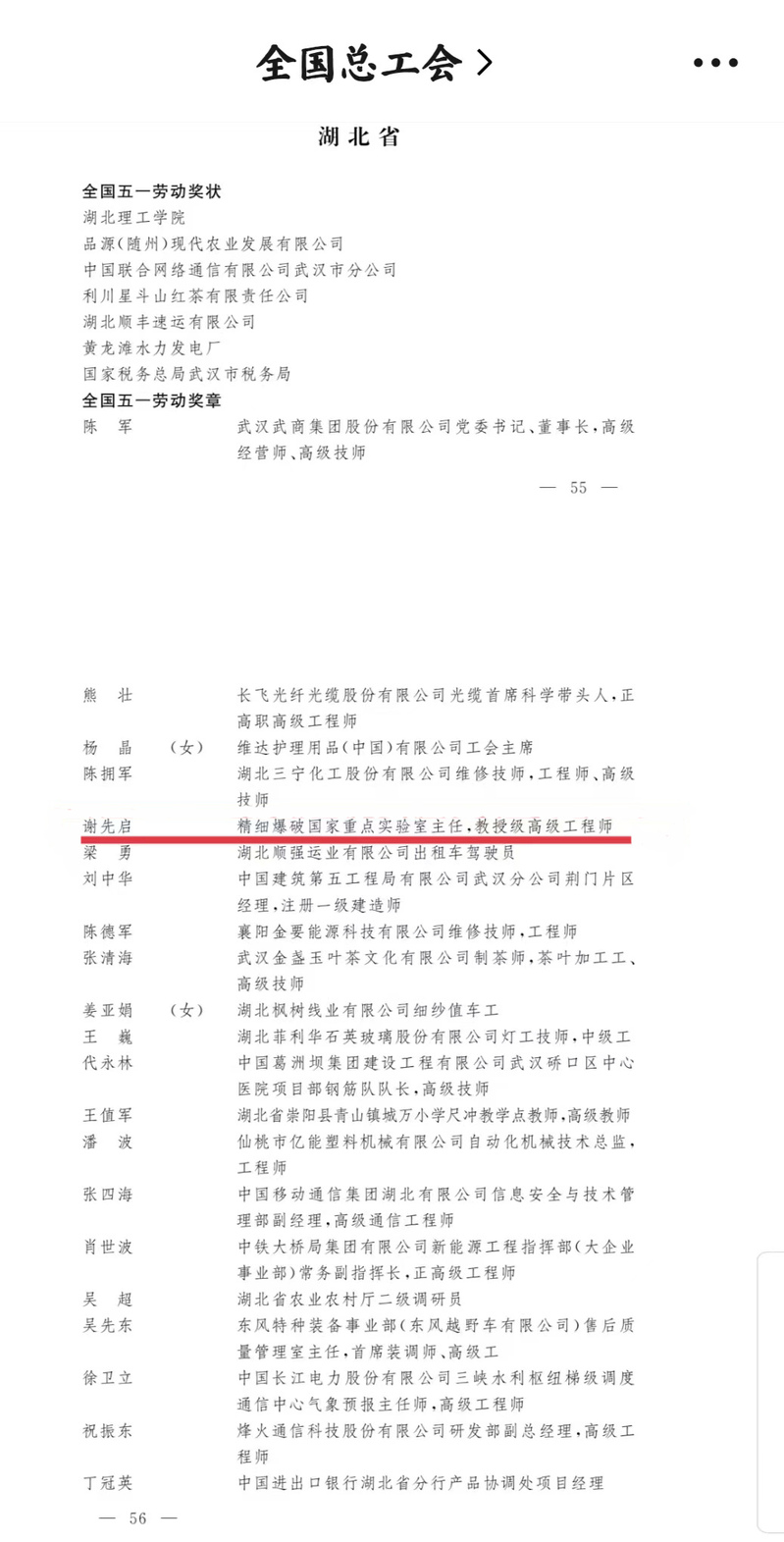 为进一步增强新时代工人阶级的自豪感和使命感,营造劳动光荣的社会风尚和精益求精的敬业风气,4月28日,2022年庆祝“五一”国际劳动节暨全国五一劳动奖和全国工人先锋号表彰大会在北京隆重召开,公布了2022年全国五一劳动奖和全国工人先锋号表彰名单。江汉大学学术委员会主任、精细爆破国家重点实验室主任、江汉大学湖北(武汉)爆炸与爆破技术研究院院长谢先启院士获“全国五一劳动奖章”。