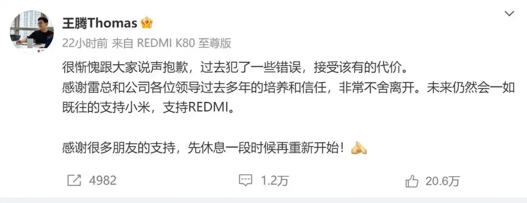 9月8日深夜,王腾(原小米中国区市场部总经理、REDMI品牌总经理)在个人微博账号回应此事:“很惭愧跟大家说声抱歉,过去犯了一些错误,接受该有的代价。”