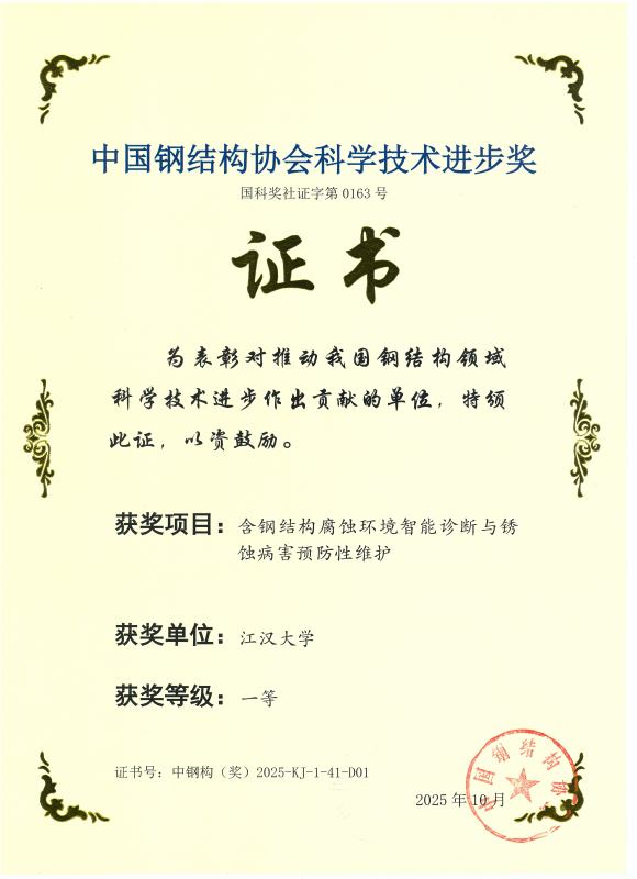 2025年10月,中国钢结构协会正式公布年度科学技术奖评选结果。江汉大学作为第一完成单位申报的科研成果《含钢结构腐蚀环境智能诊断与锈蚀病害预防性维护》,荣获2025年度中国钢结构协会科学技术进步奖一等奖。该成果...