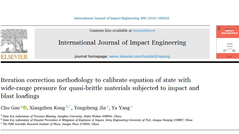 近日,精细爆破全国重点实验室爆炸力学研究所高矗副教授团队在爆炸力学领域国际顶级期刊《International Journal of Impact Engineering》上发表题目为“Iteration correction methodology to calibrate equation of...