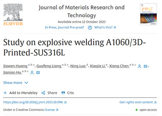 近日,实验室2022级研究生黄佳雯在国际知名期刊Journal of Materials Research and Technology(中科院一区TOP期刊,IF=6.4)发表研究论文,题为“Study on explosive welding A1060/3D-Printed-SUS316L”(爆炸焊接...