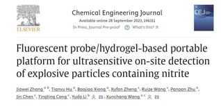 近日,实验室王迅昶副教授在爆炸物检测方向取得重要研究进展,其中研究成果“Fluorescent probe/hydrogel-based portable platform for ultrasensitive on-site detection of explosive particles containing nitrit...