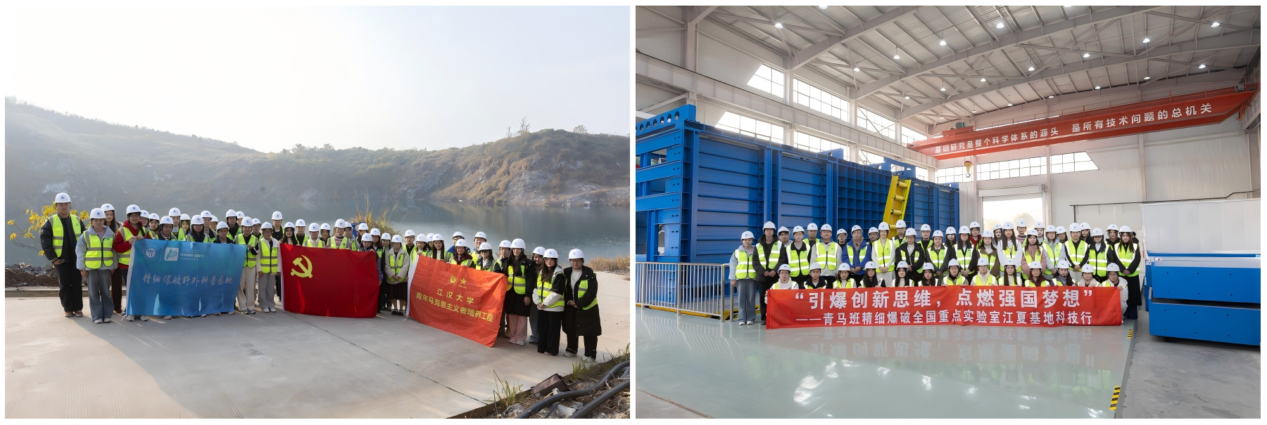 12月18日,为深入学习贯彻习近平总书记关于科技创新的重要论述,拓宽青年学生科学视野、激发科技探索热情、培育创新精神,引导青年树立科学思想与务实态度,厚植爱国情怀与报国之志,校团委联合爆破研究院组织青年马克思主义培训班骨干成员,开展“引爆创新思维,点燃强国梦想”主题科技行活动。在精细爆破全国重点实验室科研骨干、校团委兼职副书记赵国臣教授的带领下,43名学员走进精细爆破全国重点实验室江夏基地,沉浸式感受科技赋能国家发展的磅礴力量。