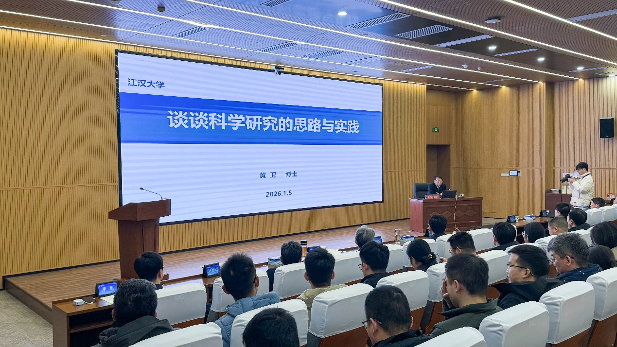 1月5日下午,江汉大学科创大楼炳灵厅内座无虚席,中国工程院院士、第十四届全国政协常委、教科卫体委员会副主任、科技部原副部长黄卫教授应邀做客我校2026年“院士讲坛”,为师生带来题为《谈谈科学研究的思路与实践》的开年首场学术报告。