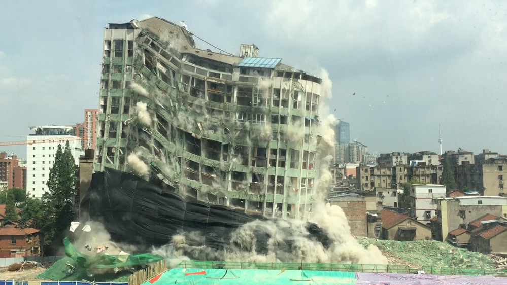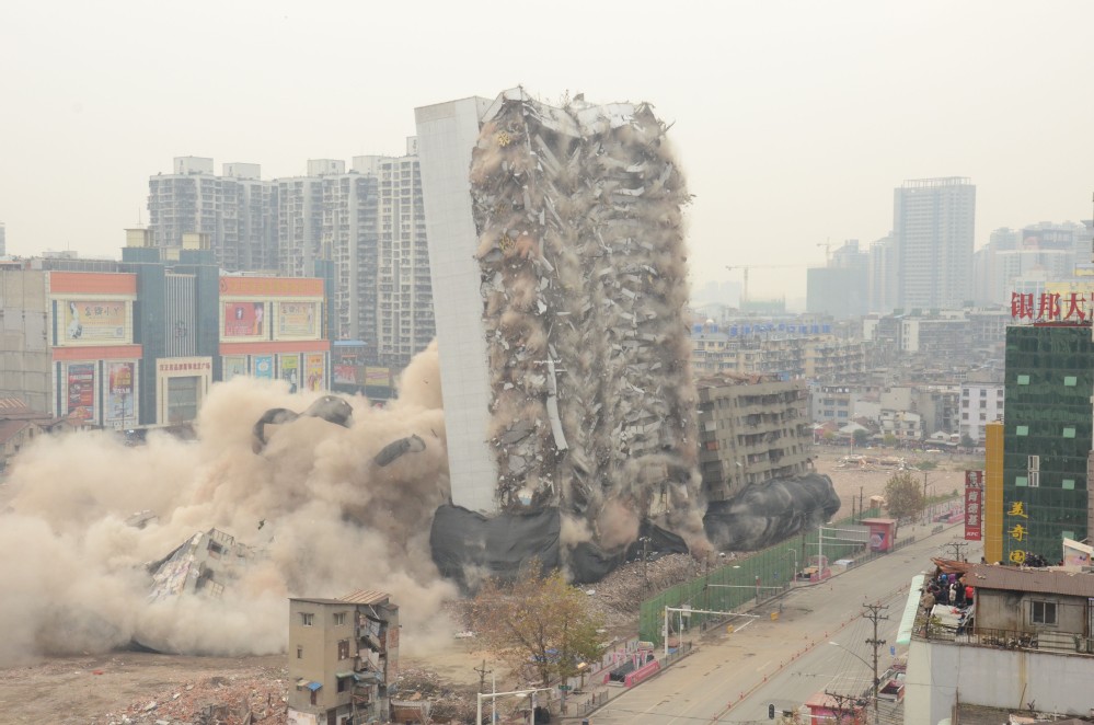 • 武汉王家墩商务区2栋19层楼房定向三次折叠” 爆破拆除工程