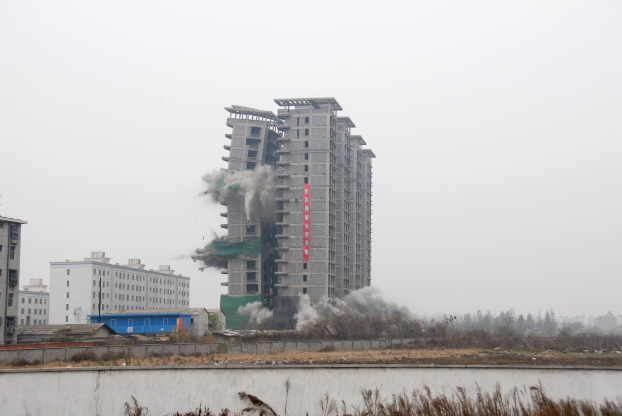 爆破技术:北面楼房采用机械拆除,南面楼房采用“向北定向倾倒”的总体爆破方案。