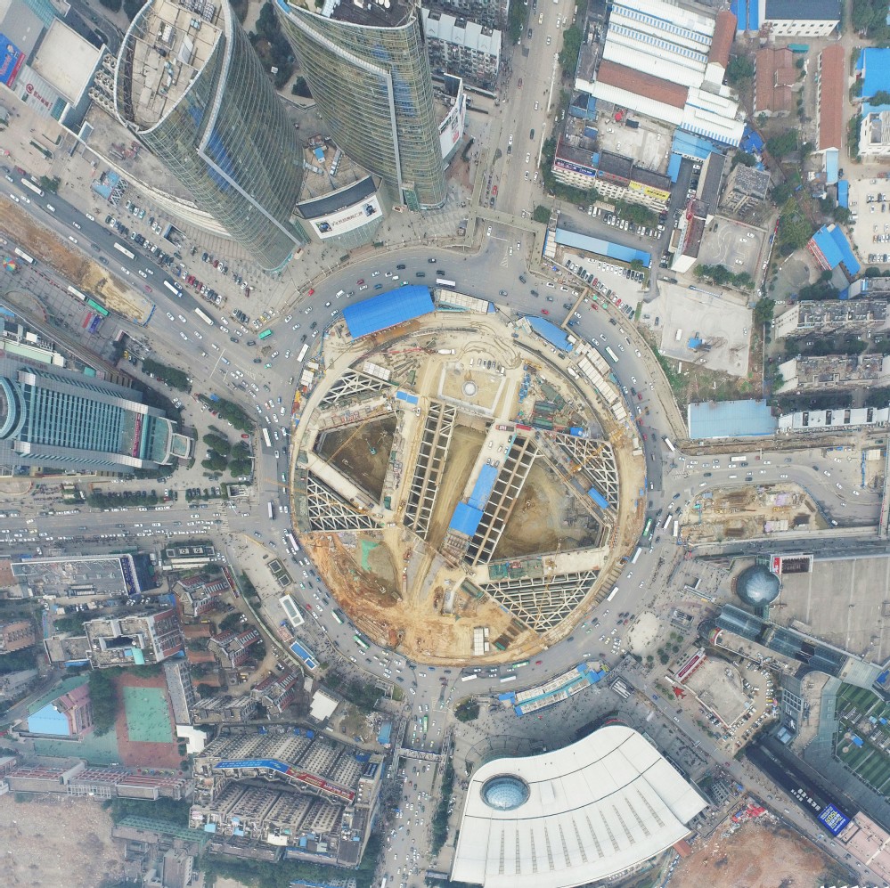 工程概况:基坑平面呈圆形,直径200m,最大开挖深度34m,基坑支撑体系由六道钢筋混凝土支撑组成,总爆破方量约2万m³。项目位于武汉市东湖新技术开发区光谷广场中心区域,4条主干道、1条次干道和1条步行街在此相交形成6路环形交叉口,车流、人流量极大,须在不封闭交通条件下实施爆破作业。